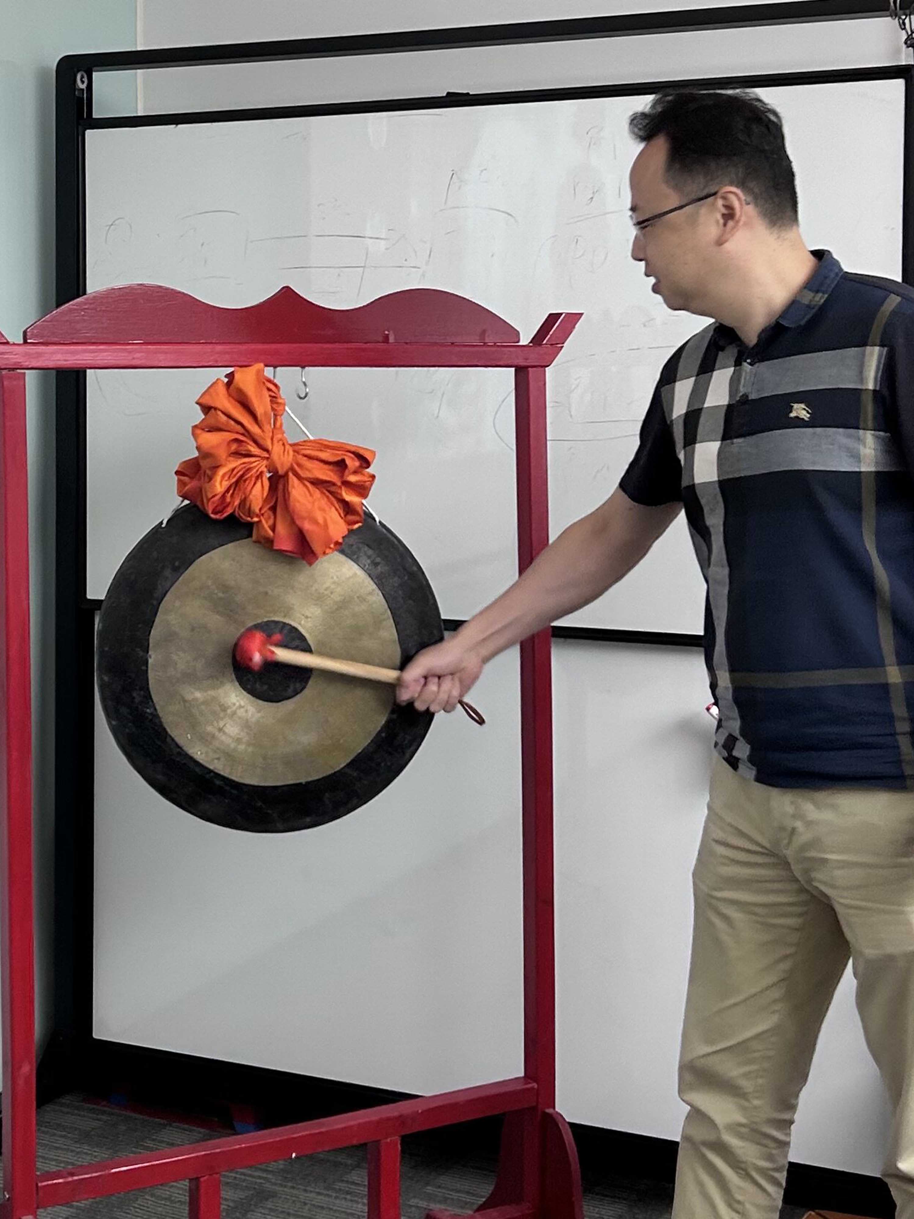 馮國軍為國內(nèi)團(tuán)隊頒獎,震天的鑼聲讓人士氣倍增