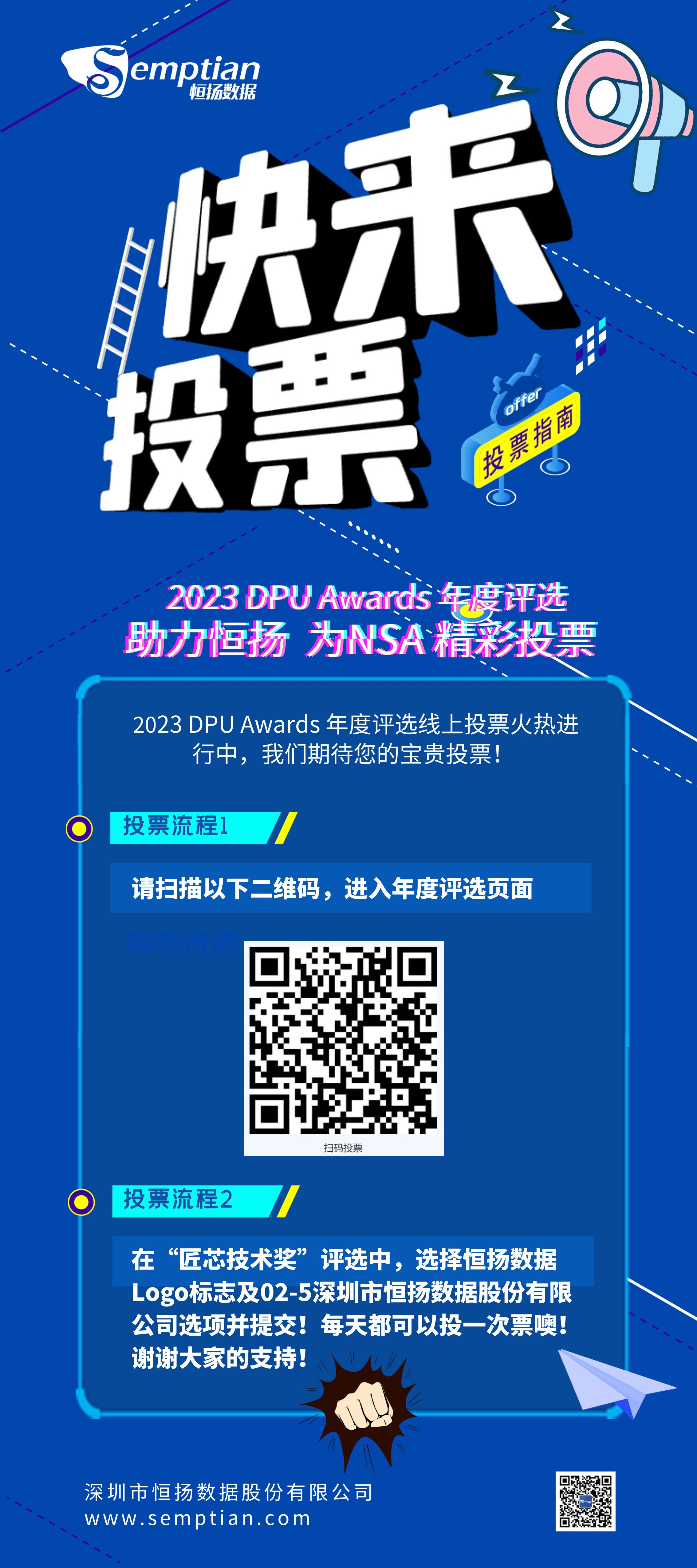 返回列表2023 DPU Awards年度評選線上投票正式啟動!即日起,2023 DPU Awards年度評選線上投票環(huán)節(jié)火熱開啟。投票時間為2023年6月27日—7月6日。恒揚數(shù)據(jù)攜NSA系列產(chǎn)品正式參選,歡迎大家給我們投上一票!見證和助力恒揚NSA DPU的起飛與成長!