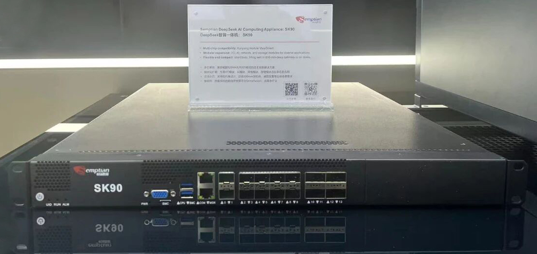 SK90智算一體機:采用1U高密度設(shè)計,搭載2顆鯤鵬920處理器(單顆CPU最高64核、2.6GHz),最大支持256GB DDR4內(nèi)存,配備多個10GE/25GE/100GE光口,無需額外網(wǎng)卡即可實現(xiàn)百G級網(wǎng)絡(luò)直連。設(shè)備支持2張昇騰AI算力卡擴展,單卡INT8算力高達(dá)352TOPS,可本地化部署DeepSeek系列1.5B-32B參數(shù)大模型,為企業(yè)AI訓(xùn)練推理、大數(shù)據(jù)分析提供開箱即用的高性能算力支撐。