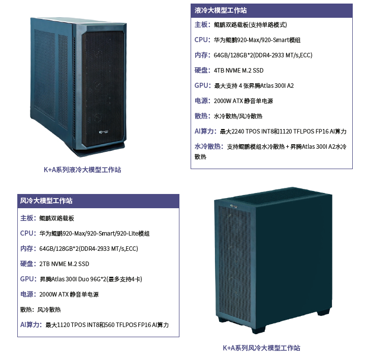 K+A系列塔式AI工作站一體機,基于1路或2路華為鯤鵬920-Max/920-Smart/920-Lite模組構建,適配華為昇騰Altas 300I Duo、Atlas 300I A2等高性能NPU,最多可搭配4張全高全長AI計算加速卡。塔式機箱,靜音設計,無需專屬機房,部署靈活,插電即用,算力高和可靠性高等特點,支持大模型本地部署。適用于辦公室、實驗室、研發(fā)空間等日常辦公環(huán)境,提供“開箱即用”的本地化大模型算力平臺,可廣泛應用于智慧辦公、智慧金融、教育科研、電子政務、數(shù)字人等應用領域。